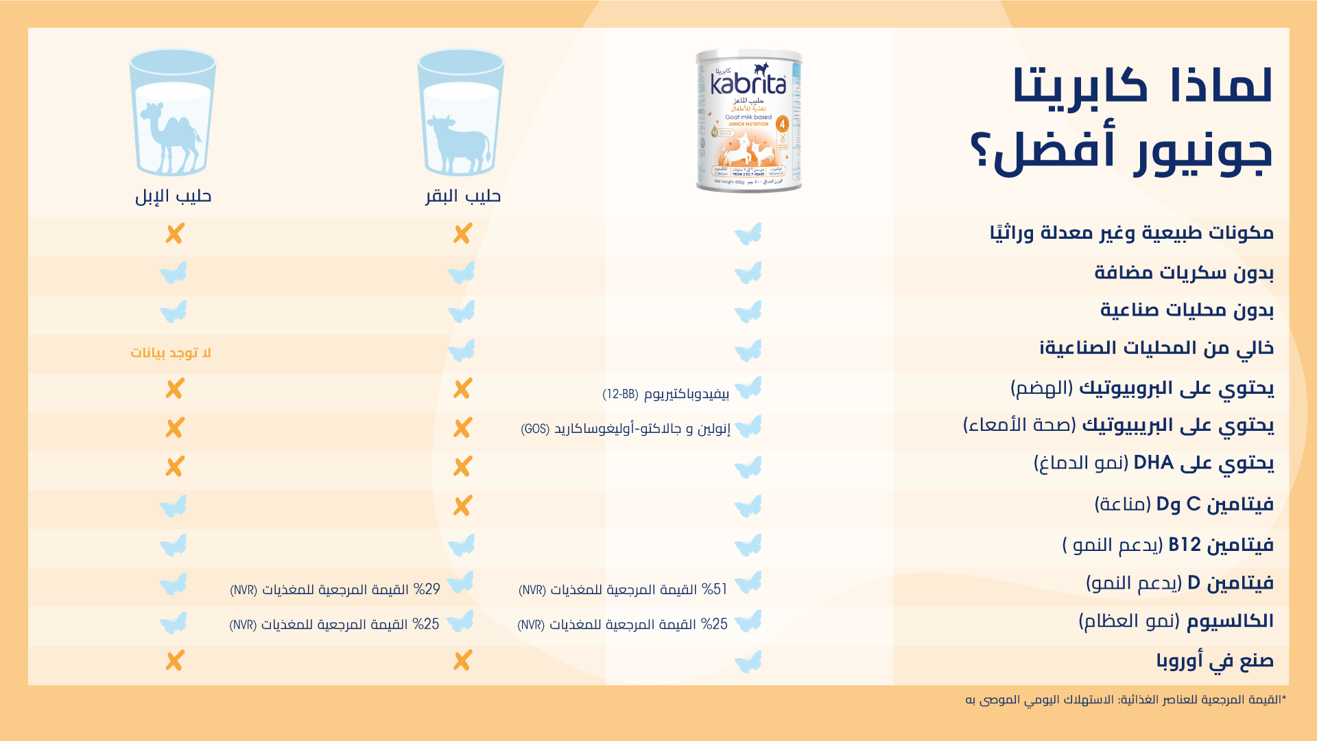 غير مناسب للأطفال دون سن ٣ سنوات. كابريتا جونيور ليس بديلاً لحليب الأم ويجب استخدامه ضمن نظام غذائي متوازن من سن ٣ إلى ٧ سنوات. اتبعي دائما تعليمات التحضير كما هو مذكور على العلبة. قد يتسبب التحضير والتغذية غير الصحيحين في مخاطر على صحة طفلك.